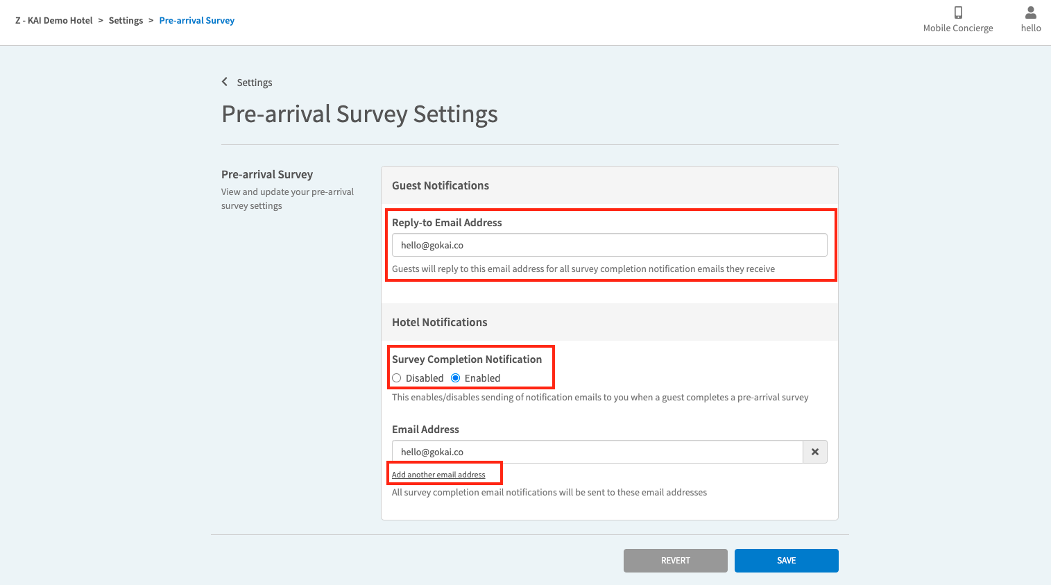 The pre-arrival survey is a very important touchpoint to understand your guests' interests and preferences. If the hotel reassigns the team/person to follow up with the guest about their special requirement or assistance, the hotel can update the emails or add up to 3 emails to be notified.