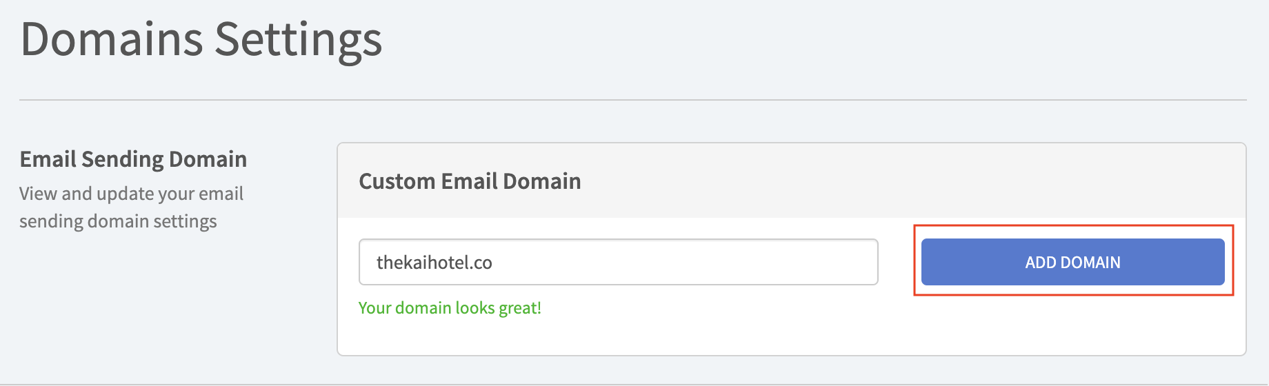 If your domain is valid, you will see the below page, then click on ADD DOMAIN button: