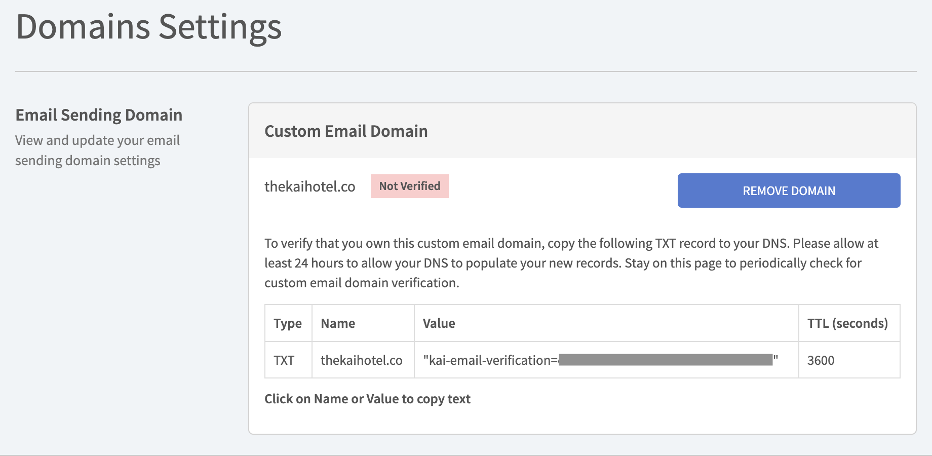 Please follow the instructions on the page and copy the TXT record to your DNS. Allow at least 24 hours for your DNS to populate the new records. Once verified, the page below will display:
