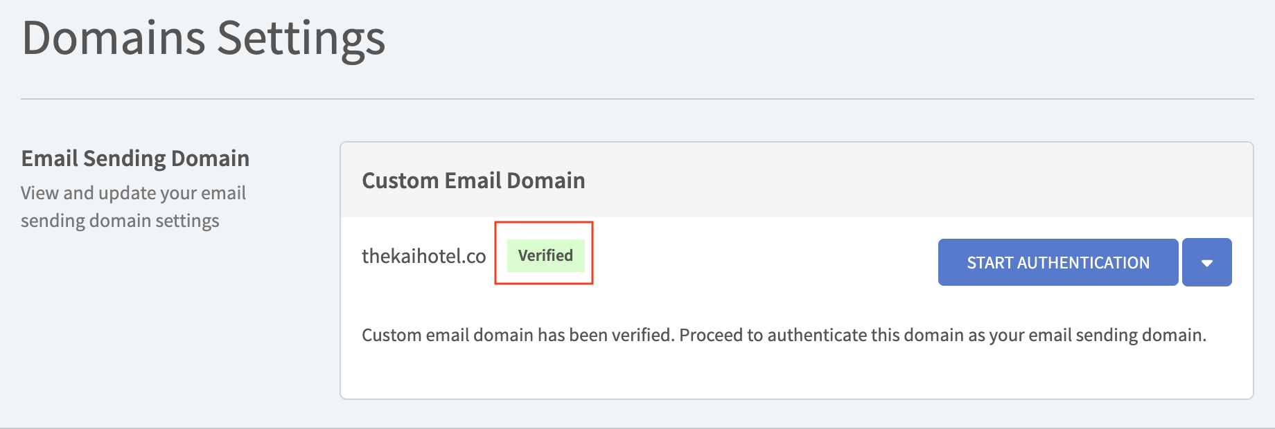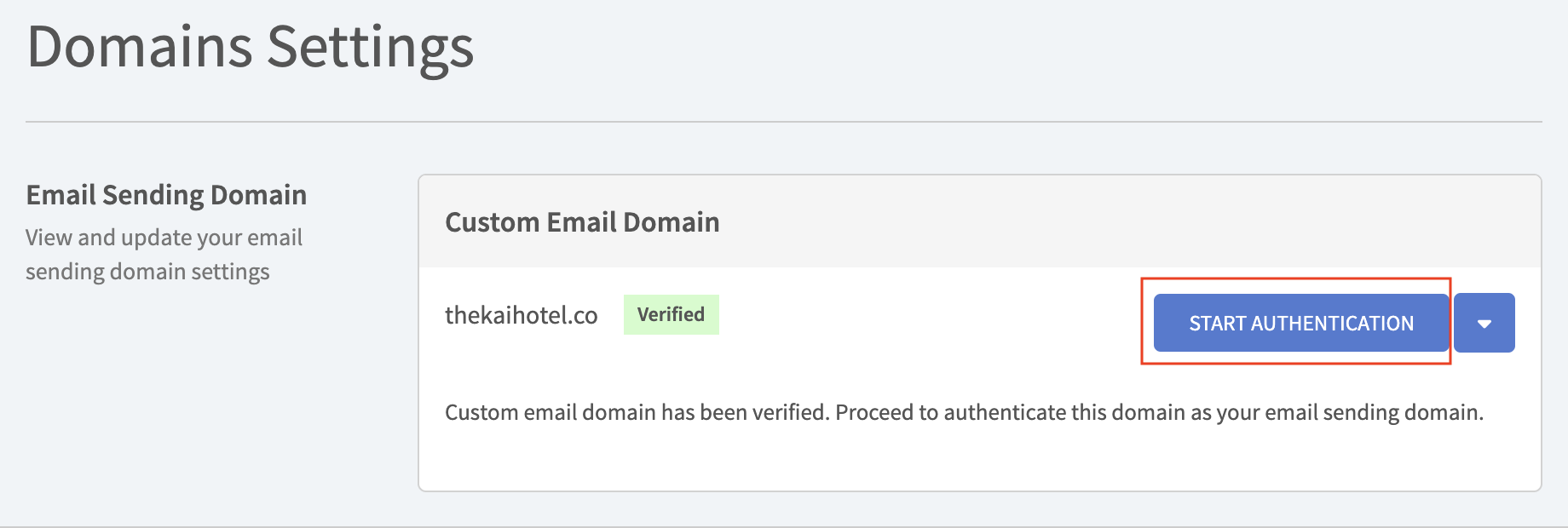 Now you can authenticate your custom email domain by clicking on the "START AUTHENTICATION" button.