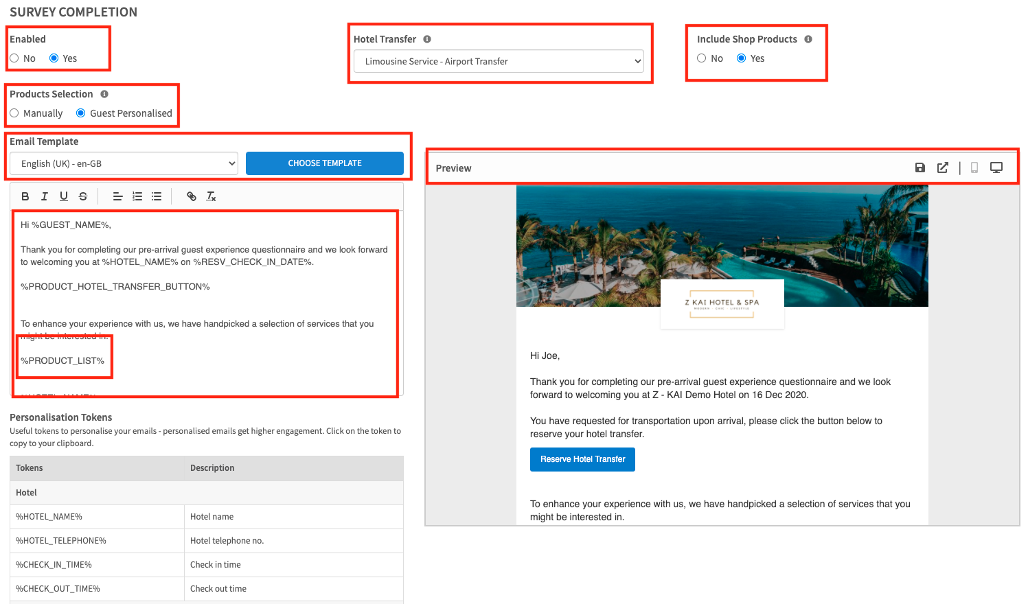 - Enable the survey completion by choosing Yes. This email will be sent to the guests who have completed the pre-arrival survey.