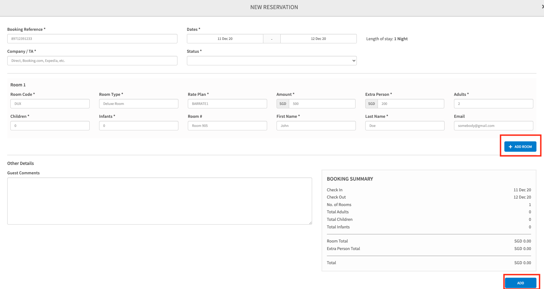 Fill up mandatory fields and click “ADD” to submit. If there are multiple rooms in one booking, click “ADD ROOM” to add more.