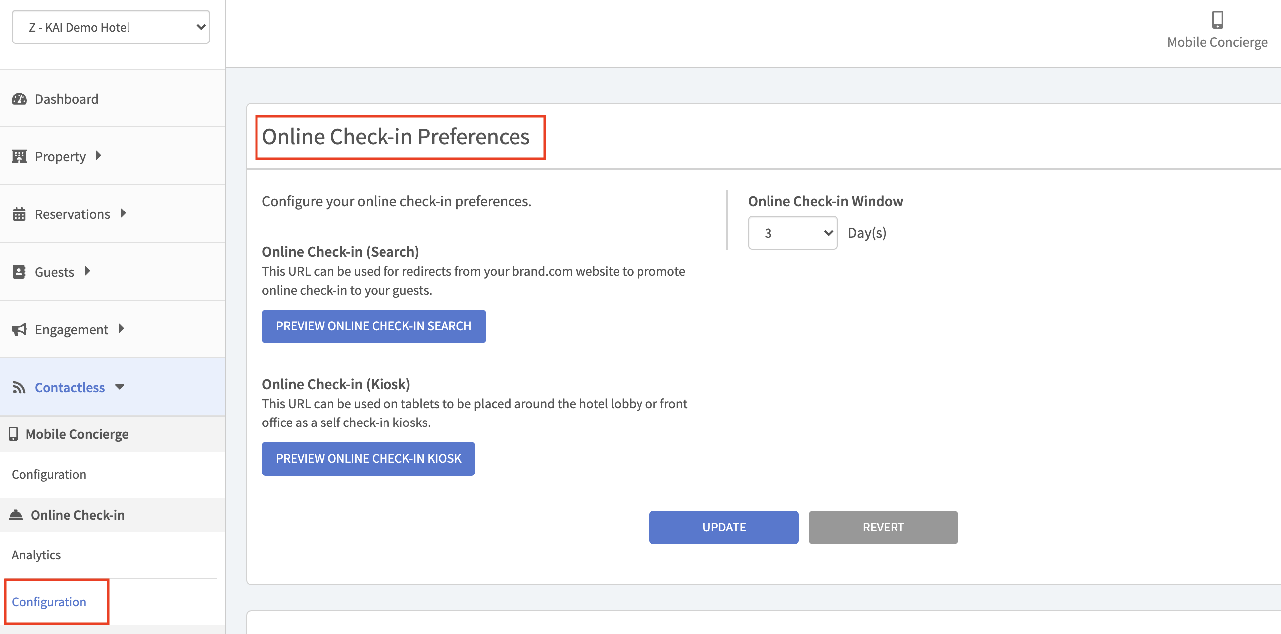Contactless -> Online Check-in Configuration -> Online Check-in Preferences