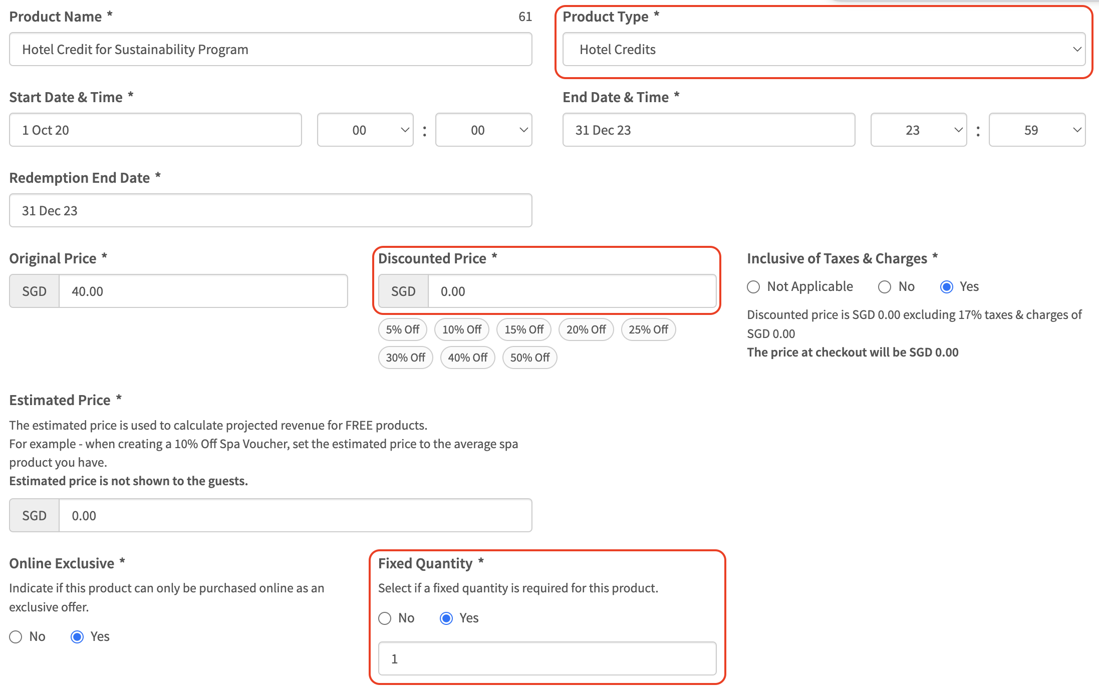 - Set Fixed Quantity as Yes and put the maximum number of vouchers that each guest can claim.