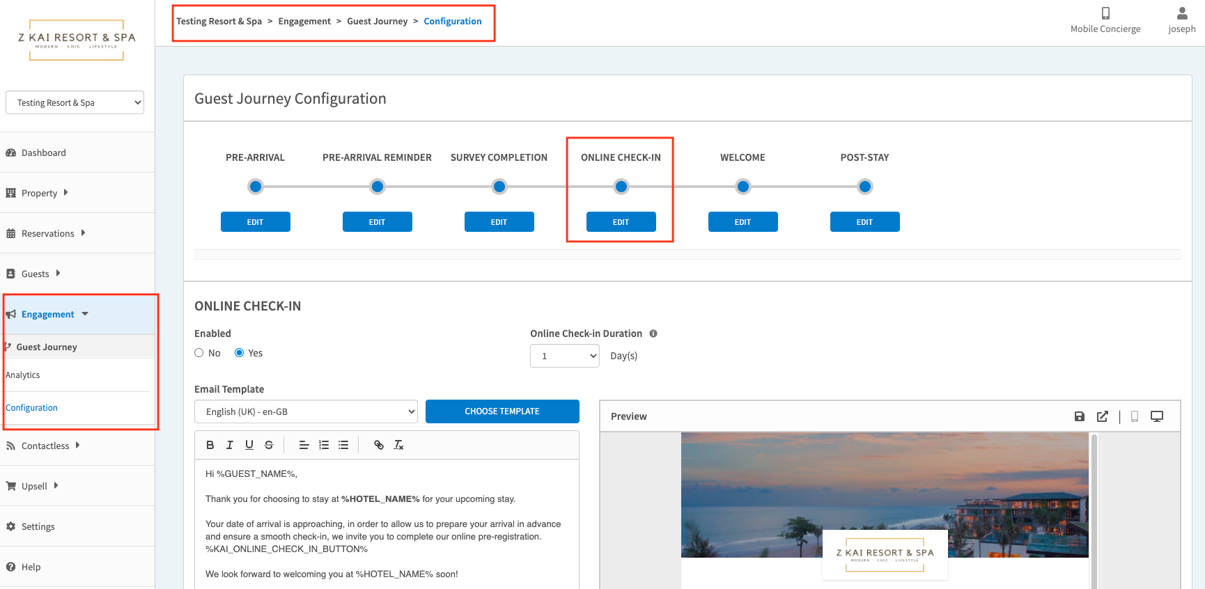 Engagement -> Guest Journey -> Configuratione -> Online Check-in