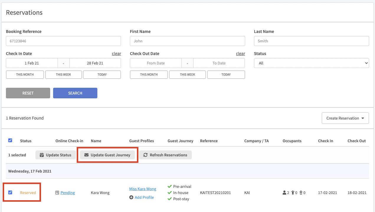 Tick the reservation you'd like to update its guest journey status, click Update Guest Journey.
