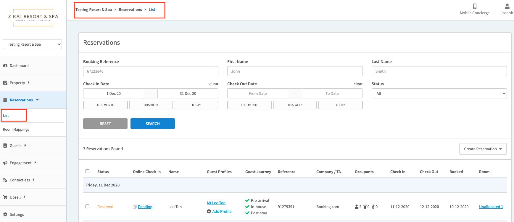 Search reservation by “Booking Reference”, “First Name”, “Last Name”, “Check-In Date” or “Check Out Date”.