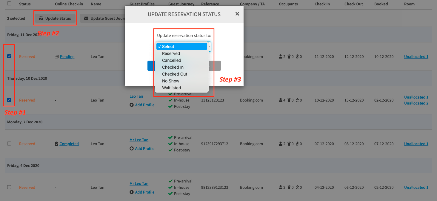 Tick the reservation to be updated, then click “Update Status”. Choose the status and click “SAVE”.