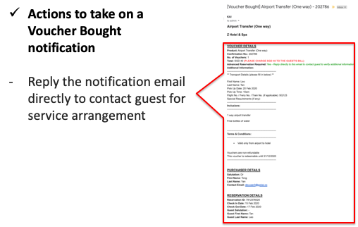 - For a product that requires advanced booking, the hotel can reply to the guest to confirm the date and time to redeem the service bought